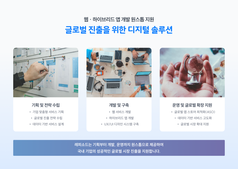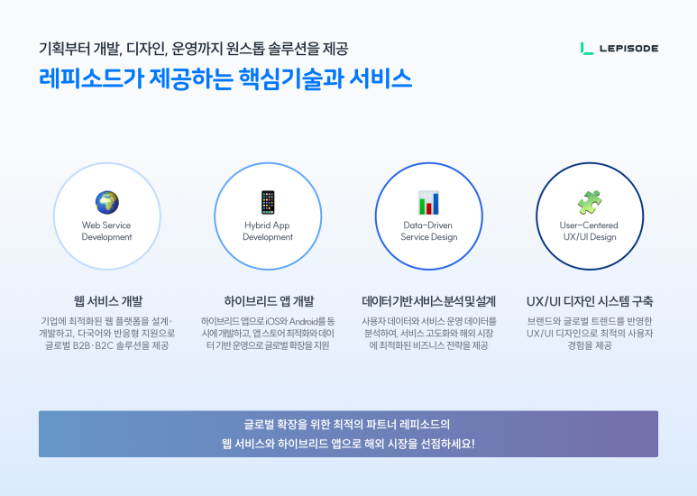 2025년 수출바우처 공급기관으로 선정된 저희 레피소드(주)는 웹 서비스와 하이브리드 앱 개발에 특화된 전문 기업으로,국내 기업들의 해외 진출을 위한 글로벌 디지털 전환 파트너가 되어 드립니다.